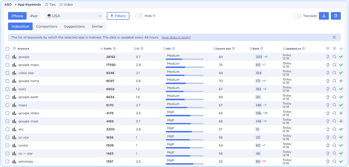 In the Brixonex App Keywords tool, in the Indexing section, you can see which keywords (search queries) your app can be found by users (as well as any other application). All search queries are displayed with the following values: traffic, app position in search results, complexity and efficiency.