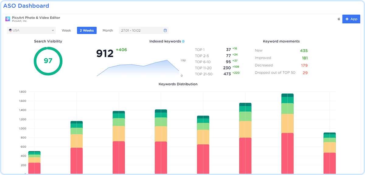 ASO (App Store Optimization) is the process of optimizing a page of a mobile application in an application store (Google Play, App Store) in order to improve its visibility for the user by the maximum number of search queries. After App Store optimization using Brixonex, the number of organic downloads increases because of covering more keywords.