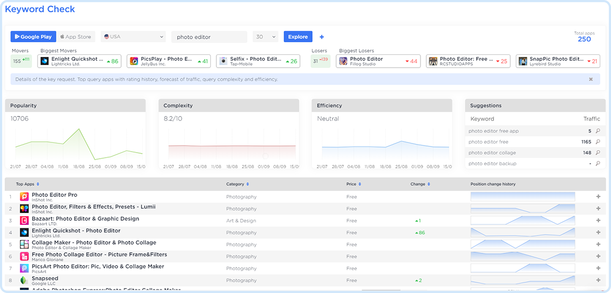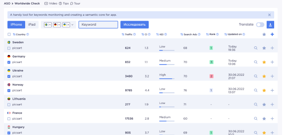 In Brixonex Keyword Monitor, you can check the position of any app by a keyword (search query) you are interested in with a graph of changes for a selected period, as well as with the following values: traffic, complexity, and efficiency. Data is updated every 4 hours or online upon request.