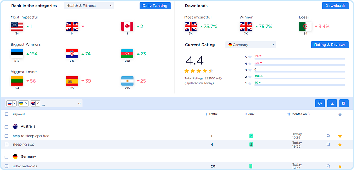 - Countries where your app has taken up new positions or lost ones